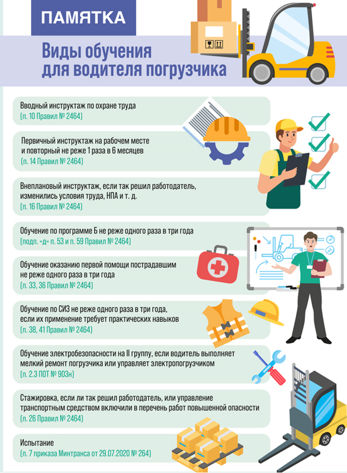 Для водителя погрузчика обязательны предварительный медосмотр при приеме на работу, а в дальнейшем — периодические осмотры не реже одного раза в два года (пункт 18.1 приложения к Порядку проведения медосмотров, утвержденного приказом Минздрава от 28 января 2021г. № 29н). Также работник должен пройти психиатрическое освидетельствование, так как управляет транспортом (пункт 1 приложения 2 приказа Минздрава от 20 мая 2022г. № 342н «Об утверждении порядка прохождения обязательного психиатрического освидетельствования работниками, осуществляющими отдельные виды деятельности, его периодичности, а также видов деятельности, при осуществлении которых проводится психиатрическое освидетельствование»). Перед и после рабочей смены водитель погрузчика проходит предрейсовый и послерейсовый медосмотры, даже если работает в пределах склада или торгового зала и не выезжает на дороги общего пользования (письмо Роструда от 10 августа 2023г. № ПГ/16443-6-1). После того как водитель погрузчика успешно проходит медосмотр и психосвидетельствование, его направляют на обучение.